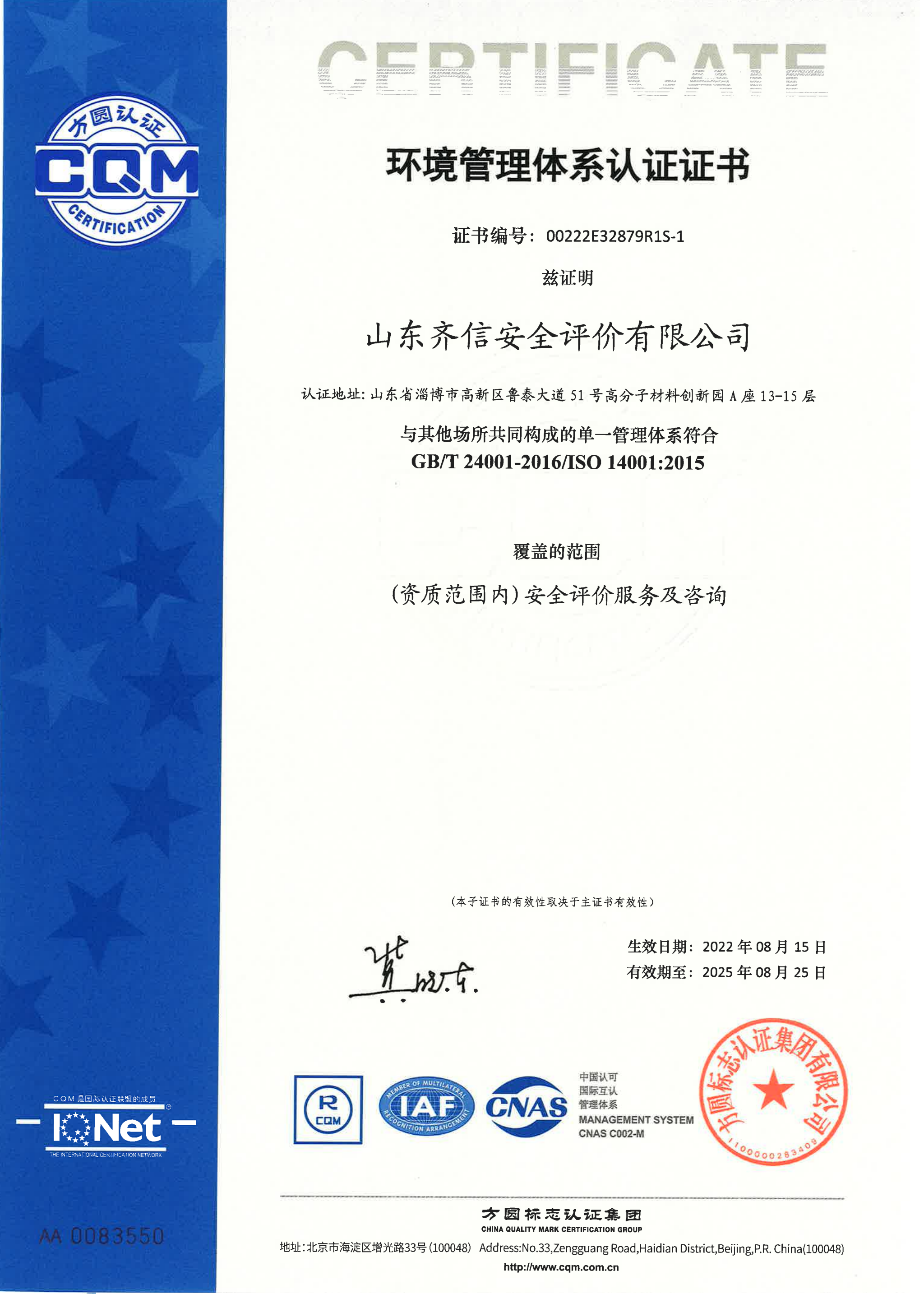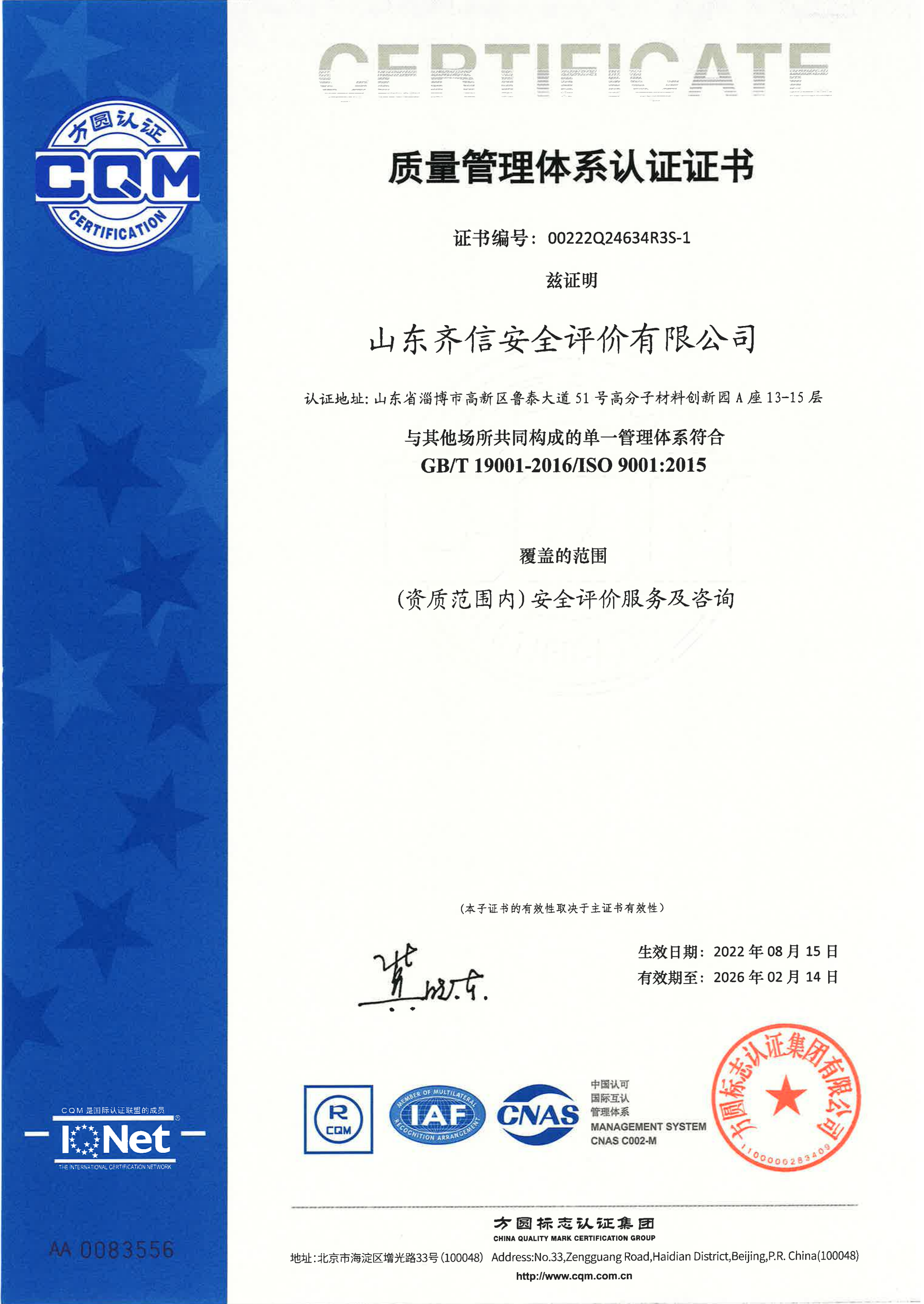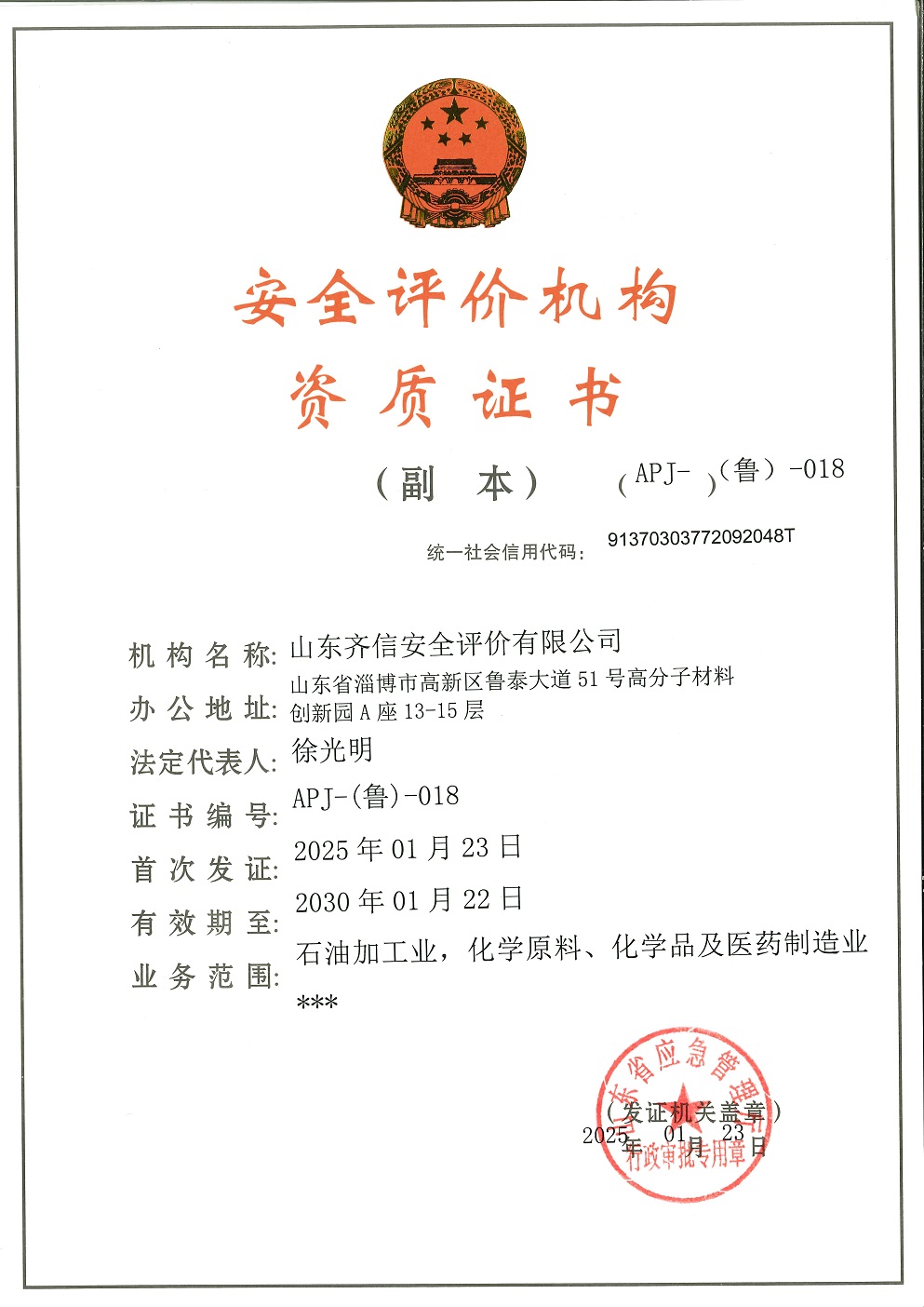 山東齊信安全評(píng)價(jià)有限公司成立于2005年3月,注冊(cè)資本300萬(wàn)元人民幣,固定資產(chǎn)總值804.8728萬(wàn)元。法定代表人徐光明,注冊(cè)地址及辦公地址位于淄博高新區(qū)魯泰大道51號(hào)高分子材料創(chuàng)新園A座13-15樓。2005年9月取得安全評(píng)價(jià)機(jī)構(gòu)乙級(jí)資質(zhì)。自國(guó)家應(yīng)急部1號(hào)令實(shí)施以來(lái),公司于2020年1月15日取得新安全評(píng)價(jià)資質(zhì),業(yè)務(wù)范圍包括:陸上油氣管道運(yùn)輸業(yè);石油加工業(yè),化學(xué)原料、化學(xué)品及醫(yī)藥制造業(yè);金屬冶煉。2018年12月21日取得安全生產(chǎn)標(biāo)準(zhǔn)化二級(jí)評(píng)審單位,評(píng)審范圍:危險(xiǎn)化學(xué)品、紡織、建材、輕工、冶金、機(jī)械。 公司現(xiàn)有人員41人,其中專(zhuān)職安全評(píng)價(jià)師37人,注冊(cè)安全工程師26人,研究員1人、碩士5人、雙學(xué)士1人,山東省安全專(zhuān)家?guī)鞂?zhuān)家1人、教授級(jí)高工1人,高級(jí)工程師8人、工程師22人,專(zhuān)職危險(xiǎn)化學(xué)品標(biāo)準(zhǔn)化評(píng)審員、工商貿(mào)標(biāo)準(zhǔn)化評(píng)審員30人,本科以上學(xué)